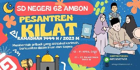 Salah satu ekstrakurikuler SD Negeri 62 Ambon adalah melaksanakan pesantren kilat ramadhan 1444 H / 2023 M.Kegiatan ini dilaksanakan pada 21 Ramadhan 1444 H s/d 23 Ramadhan 1444 H atau bertepatan dengan tanggal 12 April 2023 s/d 14 April 2023