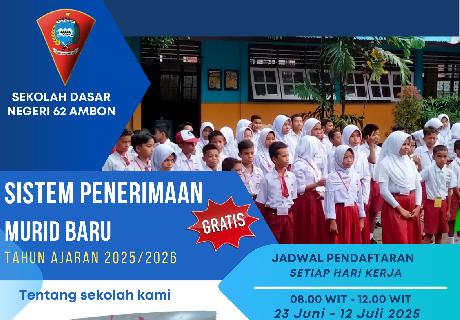 SD NEGERI 62 AMBON membuka penerimaan murid baru mulai pada 23 Juni 2025 s/d 12 Juli 2025